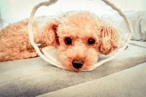 クッションの上でエリザベスカラーをつけてこちらを見るトイプードル