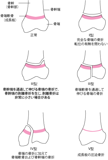 骨折の仕方にいくつかパターンがあり、その折れ方によって5つの型に分類されます(Salter-Harris分類)。